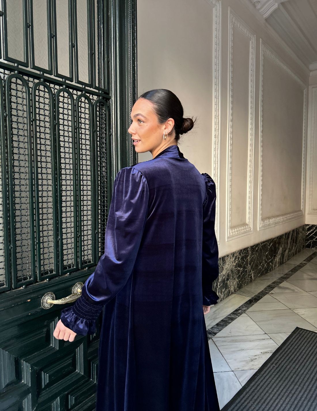 Un kimono d'invité en velours avec une coupe midi et une fente sur les côtés.